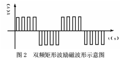 常規(guī)電磁流量計(jì)所應(yīng)用的低頻方波勵(lì)磁方式的勵(lì)磁電流頻率通常為工頻的1/4~1/10。目前深井(6000m以上)的固井施工中所使用泥漿的密度大多在1.8g/cm³以上,流速高達(dá)25m/s,所用的泥漿又是固液兩相低導(dǎo)率流體,雖然高壓下能消除非牛頓流體所帶來的測量誤差,但測量管內(nèi)會產(chǎn)生隨流量增加而頻率增加的隨機(jī)干擾噪聲。經(jīng)測定,在DN50測量管內(nèi),所用的泥漿密度為2.0g/cm³,流速在10~15m/s范圍內(nèi),測量管內(nèi)的流動噪聲主要為尖峰狀的泥漿流噪聲,量級在mv級,頻率集中在25Hz以下,如圖1所示。在勵(lì)磁頻率較低時(shí),泥漿干擾的數(shù)量級較大,高頻時(shí)干擾數(shù)量級較小,具有1/f的頻譜特性。另外,施工現(xiàn)場敲擊和震動所帶來的低頻噪聲,也會影響電磁流量計(jì)的計(jì)量精度。提高勵(lì)磁電流頻率可以規(guī)避和抑止這些干擾,以提高電磁流量傳感器輸出的信噪比,但會犧牲電磁流量計(jì)的零點(diǎn)穩(wěn)定性。本文提出新的一種勵(lì)磁方式,采用雙頻矩形波作為勵(lì)磁信號。其勵(lì)磁電流波形是在低頻矩形波上疊加高頻矩形波,用兩種采樣頻率分別得到高頻和低頻兩種流量信號。如圖2所示,高頻部分是80Hz的矩形波,外包絡(luò)線是10Hz的低頻矩形波。這樣,能克服單一低頻矩形波勵(lì)磁存在的泥漿流動噪聲,同時(shí)又能保證零點(diǎn)的穩(wěn)定性,提高流量計(jì)的計(jì)量穩(wěn)定性和響應(yīng)速度。