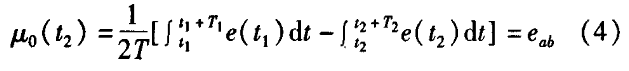 冷卻水流量計(jì)一般都采用工頻交流電源供電,其電源電壓的幅值和頻率的變化都會(huì)給冷卻水流量計(jì)帶來(lái)電源性干擾噪聲。對(duì)電源電壓的幅值變化,因采用多級(jí)集成穩(wěn)壓,一般而言電源電壓的幅值變化對(duì)電磁流量的測(cè)量精度影響不大。當(dāng)電源電壓的頻率波動(dòng)時(shí),雖然其波動(dòng)范圍有限,但對(duì)冷卻水流量計(jì)測(cè)量精度影響較大。為了解決工頻干擾問(wèn)題,實(shí)現(xiàn)對(duì)流體流速感應(yīng)電勢(shì)e柚信號(hào)的準(zhǔn)確測(cè)量,需利用以下基本關(guān)系:①勵(lì)磁周期為工頻周期的整數(shù)倍,即勵(lì)磁頻率為50/nHz(n為偶數(shù));②正負(fù)勵(lì)磁下的同相位采樣。圖2是對(duì)應(yīng)低頻矩形波勵(lì)磁形式下的典型電勢(shì)信號(hào)形式,按上述關(guān)系在一個(gè)勵(lì)磁周期下,若假設(shè)t。和t:點(diǎn)為工頻干擾的等效干擾點(diǎn),且采樣寬度T=T1=T2,則e –ab的基本算式為:,