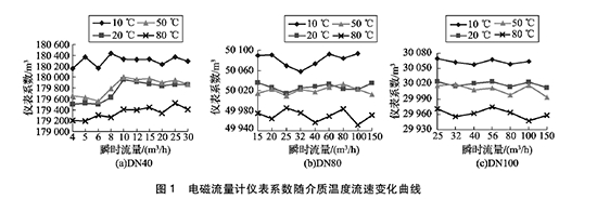 由圖1可得:( 1)隨著介質(zhì)溫度的升高,廢水流量計(jì)的儀表系數(shù)均呈逐漸降低的趨勢(shì)。其中20℃和50℃的儀表系數(shù)基本相同,10℃和80 0C的儀表系數(shù)與20℃時(shí)偏離較大。(2)溫度對(duì)廢水流量計(jì)的儀表系數(shù)在高溫以及低溫處影響明顯,以D N40廢水流量計(jì)為例,儀表系數(shù)本次實(shí)驗(yàn)高低溫處*大變化量約為0. 7% o ( 3)在廢水流量計(jì)相應(yīng)的流量范圍內(nèi),在同一溫度下,隨著介質(zhì)流速的變化,廢水流量計(jì)的儀表系數(shù)在個(gè)別點(diǎn)出現(xiàn)略微浮動(dòng),但整體變化不超過1 0. 2 %。