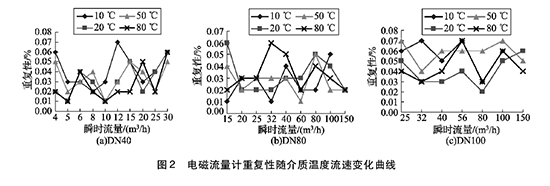 將實(shí)驗(yàn)測(cè)得的廢水流量計(jì)在不同溫度及流速下的重復(fù)性數(shù)據(jù)整理,特性曲線如圖2所示,3組曲線分別對(duì)應(yīng)DN40, DN80, DN100的3塊廢水流量計(jì)的重復(fù)性曲線。