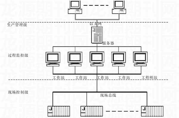 針對(duì)鎢礦選廠生產(chǎn)的實(shí)際需求,這里應(yīng)用相應(yīng)的自動(dòng)化技術(shù),對(duì)自動(dòng)化監(jiān)控系統(tǒng)進(jìn)行了設(shè)計(jì)。在系統(tǒng)設(shè)計(jì)中,遵循“方案合理、技術(shù)先進(jìn)、運(yùn)行可靠、操作方便”的原則,系統(tǒng)整體采用集散控制系統(tǒng),基于現(xiàn)場(chǎng)總線通訊,其整體網(wǎng)絡(luò)構(gòu)架如下: