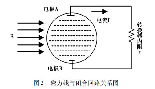 2. 1 正交干擾鹽水流量計的磁路系統(tǒng)包含有兩個勵磁線圈,而導管內(nèi)的液體與傳感器電極及轉換器結構組成了一個閉合的回路,如圖2 所示。理論情況下,磁力線( 圖中B) 應與閉合回路相平行,但是由于裝配過程中的誤差,導致磁力線不可能完全平行于這一閉合回路,出現(xiàn)部分磁力線成一定角度穿過回路的現(xiàn)象,這引起了即使沒有液體流動的情況下,傳感器的電極上也會產(chǎn)生感應電動勢,就形成了正交干擾的基本形式。