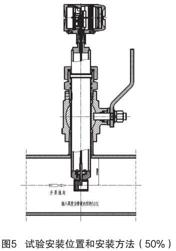 對(duì)插入式煙氣流量計(jì)和插入式電磁流量計(jì)的結(jié)構(gòu)原理進(jìn)行分析,插入式電磁流量計(jì)的信號(hào)采集點(diǎn)在標(biāo)校管道內(nèi)12.5% 為宜,因它屬電磁類流量計(jì),而煙氣流量計(jì)是根據(jù)“卡門(mén)渦街”原理進(jìn)行測(cè)量管道內(nèi)流量,根據(jù)標(biāo)校管道內(nèi)層流和湍流的分析,以及插入式煙氣流量計(jì)獨(dú)特的探頭結(jié)構(gòu)形式,確定插入式煙氣流量計(jì)的插入深度為標(biāo)校管道內(nèi) 50%,試驗(yàn)安裝位置和安裝方法如圖 5 所示。