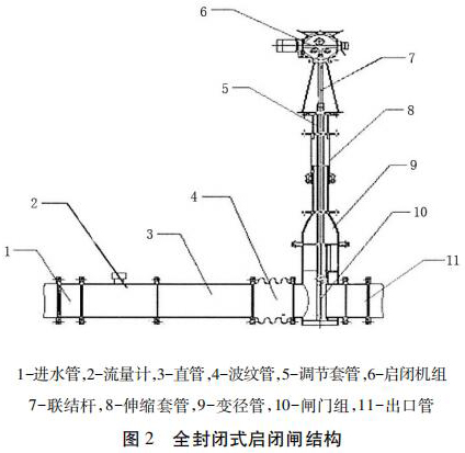 包括進(jìn)水管、直管、出水管、過熱蒸汽流量計(jì)組和啟閉機(jī)組,進(jìn)水管、直管、出水管從左到右依次連接,過熱蒸汽流量計(jì)組安裝在直管和出水管之間且位于出水管的入口處,過熱蒸汽流量計(jì)組通過聯(lián)結(jié)桿與啟閉機(jī)組的輸出端連接。為防止泥沙淤積影響啟閉,過熱蒸汽流量計(jì)采用閘板式啟閉結(jié)構(gòu)。密封式啟閉閘為整體封閉管道式,全部采用不銹鋼材料,水流通過管道流出讓整個(gè)閘井內(nèi)干燥無水。伸縮套管與波紋管的設(shè)計(jì)讓檢修與清理淤泥更加方便。過熱蒸汽流量計(jì)裝有荷載限制器,其布置受力明確、結(jié)構(gòu)緊湊、動(dòng)作可靠。當(dāng)?shù)蹙呱系暮奢d達(dá)到額定值的 110%時(shí),或電機(jī)電流超過額定電流 150%時(shí),系統(tǒng)自動(dòng)切斷操作電源以保護(hù)設(shè)備安全。