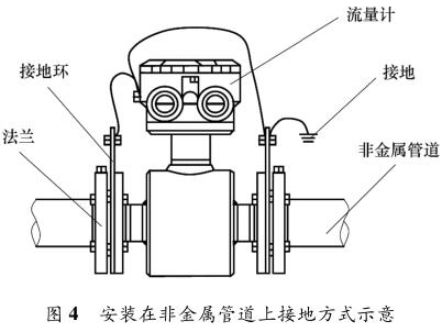 智能型防腐電磁流量計安裝在金屬管道上,安裝時將金屬管道與智能型防腐電磁流量計相連接,接地線再接入接地網(wǎng),如圖 3 所示。