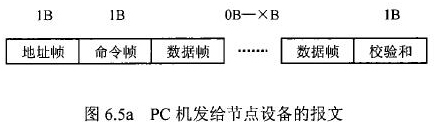 在飲用水流量計(jì)等節(jié)點(diǎn)設(shè)備和C機(jī)通信的過程中,由地址幀、命令幀、數(shù)據(jù)幀、校驗(yàn)和可組成各種功能不同的報(bào)文。由于采用主從工作方式來實(shí)現(xiàn)通信,飲用水流量計(jì)等節(jié)點(diǎn)設(shè)備僅能接收并執(zhí)行PC機(jī)發(fā)送來的控制命令,而不能發(fā)送命令給PC機(jī)。因此,由PC機(jī)發(fā)往流量計(jì)等節(jié)點(diǎn)設(shè)備的報(bào)文一般包括一個(gè)地址幀,一個(gè)命令幀,若干個(gè)數(shù)據(jù)幀和一個(gè)校驗(yàn)和,其報(bào)文格式圖.6a5所示;而由流量計(jì)等節(jié)點(diǎn)設(shè)備發(fā)往PC機(jī)的報(bào)文一般包括一個(gè)地址幀,若干個(gè)數(shù)據(jù)幀和一個(gè)校驗(yàn)和,其報(bào)文格式如圖6.5b所示。
