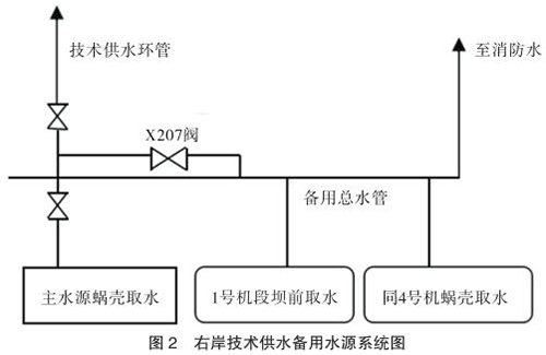 技術(shù)供水系統(tǒng)設(shè)有主、備用水源。主水源是蝸殼取水,作為機組技術(shù)供水的主用水源。備用水源有兩個,一個是設(shè)在 1 號機段的壩前取水,取水口高程為 145m,另一個是同 4 號機組蝸殼取水共用取水口的蝸殼備用取水。兩路備用水源均接到備用總水管,并通過 X207 閥分別與各臺機組的技術(shù)供水系統(tǒng)相連通(見圖 2)。