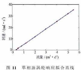 采用同樣的方法,對單相油條件下渦輪響應(yīng)規(guī)律進行研究(見圖11),測得單相油的啟動排量為0.08m3/d。對單相油的實驗結(jié)果進行擬合,可得單相油的響應(yīng)曲線為ω=6.73Q-6.72。與水對比而言,油的擬合曲線斜率更大,即隨著流量增加轉(zhuǎn)速增加得略快。