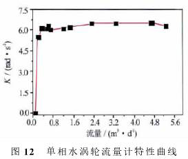 可以看出,渦輪啟動后*先進入一個非線性段,在非線性相應(yīng)段,K值隨著流量增加而增大;當流量比較大(單相水超過0.5m3/d,單相油超過1m3/d)時,渦輪進入線性段,在線性響應(yīng)段,K值達到峰值,有相對較小的波動。