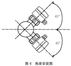 垂直安裝時(shí)確保流向由下而上,如圖 4 中箭頭所示,應(yīng)與管道水平中心線(xiàn)成 45 度角安裝航空煤油流量計(jì)。
