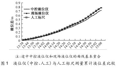 液位的測量是整個容積法校驗的重點,其準(zhǔn)確度直接關(guān)乎計量結(jié)果。由于液位儀信號非數(shù)字傳輸,在測量過程中安裝了人工標(biāo)尺這一液位簡易測量裝置,供校核液位儀使用。將測量的累計液位差同液位儀(中控、現(xiàn)場)測得數(shù)據(jù)進行比較,如圖 1 所示。