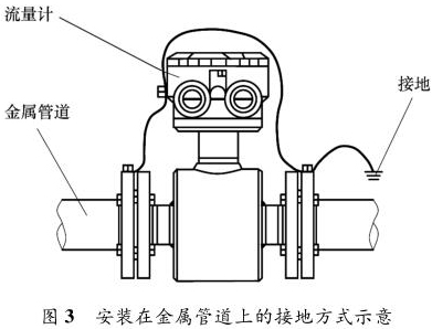 液體流量計(jì)安裝在金屬管道上,安裝時(shí)將金屬管道與液體流量計(jì)相連接,接地線再接入接地網(wǎng),如圖 3 所示。