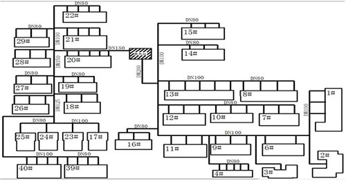 某小區(qū)住宅樓建設(shè)于1996年,建筑結(jié)構(gòu)為磚混建筑,建筑面積為54931m2,共30棟住宅樓。2017年繳費(fèi)739戶,總采暖面積為47141m2。換熱站位于小區(qū)中部,板式換熱機(jī)組設(shè)計換熱面積為50000m2,循環(huán)泵額定功率為30kW,流量為200m³/h,揚(yáng)程為32m。庭院管網(wǎng)共分為2個支狀供回水環(huán)路,該小區(qū)供熱管網(wǎng)見圖1所示。