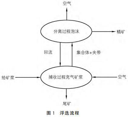 浮選是依據(jù)礦物原料表面的化學性質(zhì),向待浮選的礦漿中加入浮選藥劑和空氣,使其與礦漿充分融合,并根據(jù)各礦物原料的黏附程度的不同,分選出不同的礦物。浮選過程一般分為礦漿碰撞、黏附、上浮以及精煤溢出四個階段。礦物原料在浮選藥劑的作用下,與 空氣發(fā)生器產(chǎn)生的小氣泡發(fā)生充分碰撞,進行礦物捕集。利用礦物間的疏水特性,礦物粘附于氣泡表面,氣泡不斷上浮,形成精礦泡沫層,精礦溢出浮選柱;由于尾礦的親水特性,尾礦沉入底部并排出。浮選流程如圖1所示。