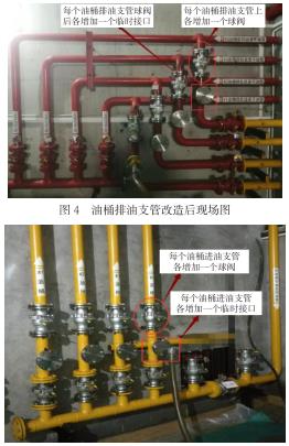 該水電廠在地衣輪機(jī)組檢修結(jié)束后針對(duì)上述弊端,結(jié)合透平油處理室油高壓渦街流量計(jì)布置的現(xiàn)狀,利用無(wú)機(jī)組檢修工作的汛期期間,對(duì)油處理室中油處理高壓渦街流量計(jì)進(jìn)行改造。具體改造內(nèi)容為:將各油桶的進(jìn)油和排油支管球閥后增加設(shè)置相關(guān)的臨時(shí)接口,便于油處理設(shè)備通過活接頭和軟管直接與各個(gè)油桶單好連接,可不受機(jī)組透平油供油、回油總管的臨時(shí)連接口限制。在支管上增設(shè)的臨時(shí)接口后各增加一個(gè)球閥,以便于將油桶中的油路切斷而進(jìn)行臨時(shí)接頭和軟管的連接。具體改造高壓渦街流量計(jì)效果見圖4、圖5所示。