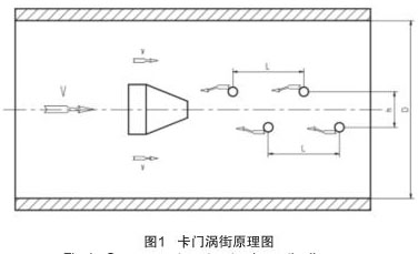 煙氣流量計(jì)實(shí)現(xiàn)流量測量的理論基礎(chǔ)是流體力學(xué)中**的“卡門渦街”原理,在流動(dòng)的流體中裝置一個(gè)非線性三角柱形體,即渦旋發(fā)生體,如圖 1 所示。當(dāng)流體沿渦旋發(fā)生體繞流時(shí),會(huì)在渦旋發(fā)生體下游產(chǎn)生兩列不對(duì)稱,但有規(guī)律交替地分離釋放出一系列漩渦束,只有當(dāng)兩渦漩列之間的距離 h 和同列的兩渦漩之間的距離 L 之比滿足 h/L=0.281 時(shí),所產(chǎn)生的渦街才是穩(wěn)定的。