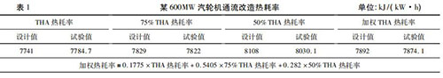 隨著火電機組利用小時數(shù)降低,發(fā)電企業(yè)一般都會根據(jù)不同負(fù)荷工況下的實際運行小時數(shù),確定機組熱耗率考核權(quán)重,形成*終的加權(quán)熱耗率考核值??己思訖?quán)熱耗率對設(shè)備廠家末級葉片選型、高壓調(diào)門與高壓缸匹配性提出了更高的要求,在當(dāng)前負(fù)荷率偏低的情況下增強了發(fā)電企業(yè)的競爭力。然而,僅僅對加權(quán)熱耗率進行考核是不夠的,設(shè)備廠家為了增強自身的競爭力,往往會把全部重點放在如何降低占比大的低負(fù)荷熱耗率上而犧牲高負(fù)荷的熱耗率,這無疑削弱了發(fā)電企業(yè)的適應(yīng)性。某廠一臺 600MW 汽輪機通流改造時僅對加權(quán)熱耗率進行考核,THA 熱耗率要高出設(shè)計值43. 7 kJ/( kW·h) ,詳見表 1。通流改造時既要對加權(quán)熱耗率進行考核,也要對 THA工況時熱耗率進行考核。