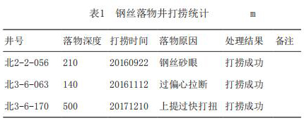 表1為氣體轉(zhuǎn)子流量計打撈統(tǒng)計表,可以看出自2016年9月開始即在現(xiàn)場進行了應用。為了展示試驗成果的普遍性,分別從不同注入方式、不同落物深度、不同落物原因的角度,共應用3口鋼絲落物井,打撈成功為100%。