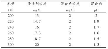 (2)加酸期間附企水處理公司人員負責每0.5h在高架水槽處化驗污環(huán)水pH值,每2h監(jiān)測一次高架水槽內(nèi)掛片腐蝕情況,將化驗結果告知燃氣崗位人員,崗位職工負責記錄。當pH小于6時,附企給水人員在高架水槽處加入堿液進行調(diào)整,同時根據(jù)洗滌塔循環(huán)水量變換情況調(diào)整清洗劑濃度見表3。