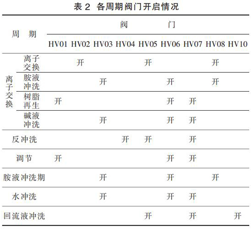 5)回流沖洗周期。 胺液每天都需取樣化驗,如果發(fā)現胺液中有不溶或懸浮的過渡金屬聚集,則每天運行周期結束后需利用回流液對樹脂進行清洗,以防止腐蝕和樹脂損壞。 如果選擇了此選項,PLC程序會在每天完成目標數量的離子交換周期后,自動執(zhí)行回流液清洗周期。 各周期閥門對應開關情況,如表 2 所示。