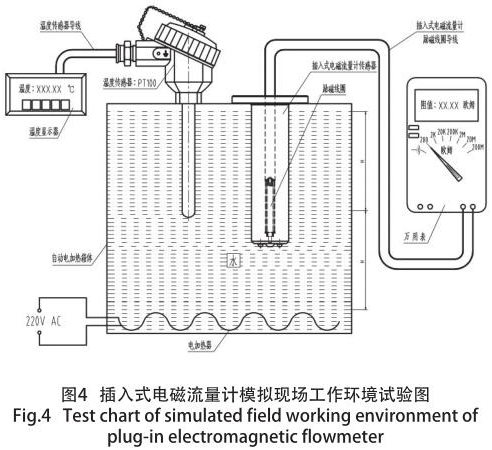 其原因是:勵(lì)磁線圈的阻值及匝數(shù)是按照常溫狀態(tài)下進(jìn)行設(shè)計(jì)的,而含有勵(lì)磁線圈的測水流量計(jì)經(jīng)常是高于常溫狀態(tài)下進(jìn)行安裝、使用(如:高爐回水、供熱管道等),勵(lì)磁線圈的阻值隨使用環(huán)境溫度的變化而變化,致使測水流量計(jì)測量時(shí)的準(zhǔn)確度大為降低,性能的不確定性大為增加,為了保證儀表的高準(zhǔn)確度和穩(wěn)定性,在不同的季節(jié)(主要是環(huán)境溫度和介質(zhì)溫度),經(jīng)過大量模擬現(xiàn)場實(shí)際情況的試驗(yàn),并結(jié)合轉(zhuǎn)換器的技術(shù)參數(shù)要求,得出一個(gè)完善的勵(lì)磁線圈各種技術(shù)參數(shù)。模擬現(xiàn)場試驗(yàn)裝置如圖 4 所示。