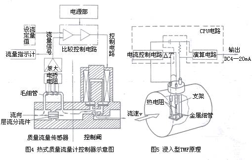 市場上熱分布式tmf按測量管內(nèi)徑分為細(xì)管型(也有稱毛細(xì)管型)和小型兩大類,結(jié)構(gòu)上有較大區(qū)別。小型測量管儀表只有直管型,內(nèi)徑為4mm;細(xì)管型測量管內(nèi)徑僅0.2~0.5mm。稍大者為0.8~1mm,極容易堵塞,只適用于凈化無塵氣體。細(xì)管型儀表還有一種帶有調(diào)節(jié)單元和控制閥等組成一體的熱式質(zhì)量流量控制器,結(jié)構(gòu)如圖4所示。